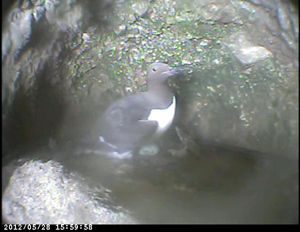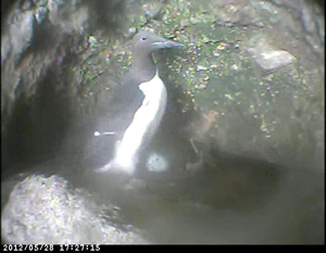 今年新たに設置した監視カメラにより、産卵場所が初めて特定されました。今後も観察を続け、ヒナシェルターの設置などウミガラスの保護対策に役立てていく予定です。