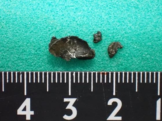 - 胃の中から3個の鉛片を確認。鉛片は、鈍い光沢の金属で、大小不同・扁平であり鉛ライフル弾の破片の可能性が高い。