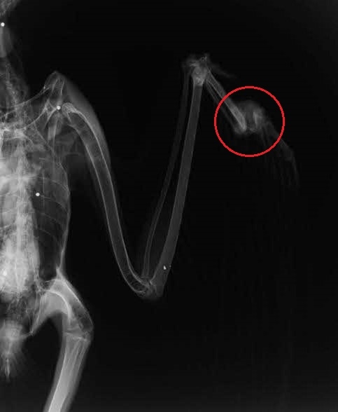 (白い点として映っているのが散弾。右側写真の赤丸が骨折部位)