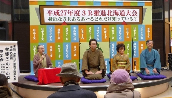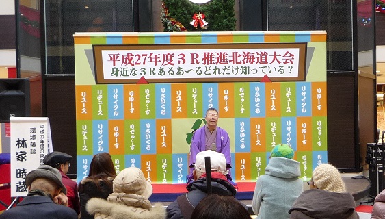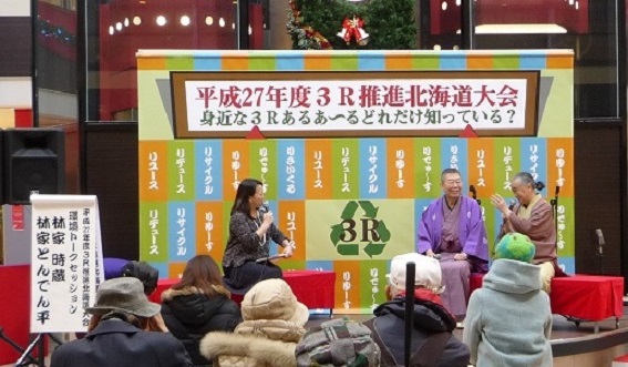 今大会では、札幌を拠点に活動している一世一代時代組の皆さん、テアトルアカデミーアイドルクラスサッポロクマ組の皆さんによるエコパフォーマンスステージ、落語家の林家時蔵師匠の3R落語、林家時蔵師匠と林家とんでん平師匠による環境トークセッション、林家とんでん平師匠と落笑会による環境大喜利などをはじめ、クイズラリー、エコバッグなどを製作するワークショップ、3R一コママンガパネル展示など、多彩な催しやコーナーを設けました。来場された皆さんは、大人から子供まで楽しみながら3Rを学び、ごみを減らすライフスタイルや資源リサイクルの大切さを考えました。